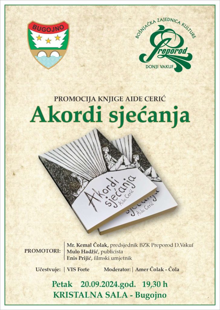 U petak, 20. septembra u Kristlnoj sali općine Bugojno održat će se promocija knjige „Akordi sjećanja“ autorice Aide Cerić. Pokrovitelj ovog kulturnog događaja je općina Bugojno, a izdavač BZK „Preporod“ Donji Vakuf.